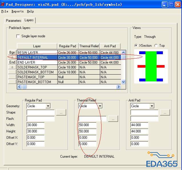 2、如果你没设Flash,设了Thermal Relief下的circle 等等,那么(在负片层中)就按照你的这个设置来。一般会连接成十字形,你设的尺寸就是热风焊盘的外径