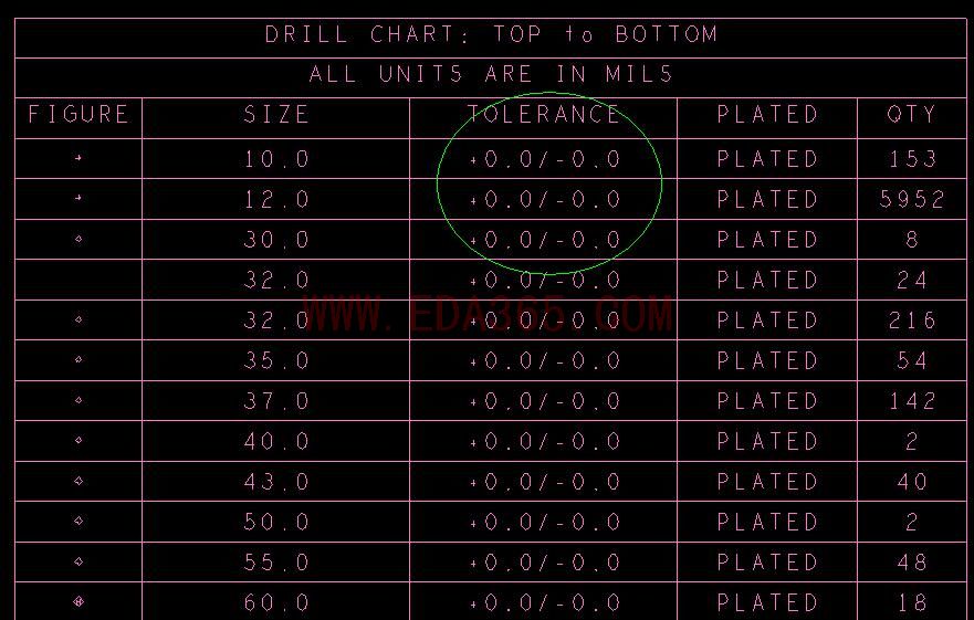 如附档,如果用manufacture/NC/drill lengend出钻孔层的表格,怎样可以把表格中的tolerance项去掉,或者设置里面的正负偏差