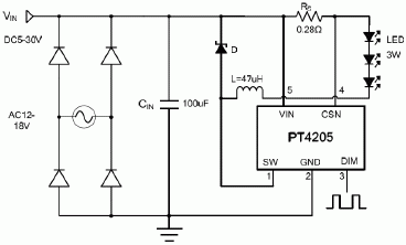 PT4205是一款连续电感电流导通模式的降压恒流源,用于驱动一颗或多颗串联LED。PT4205输入电压范围从5伏到30伏,输出电流可调,最大可达1.2安培。根据不同的输入电压和外部器件,PT4205可以驱动高达数十瓦的LED。PT4205 内置功率开关,采用高端电流采样设置LED平均电流,并通过DIM引脚可以接受模拟调光和很宽范围的PWM调光。内置过温软保护功能,当温度过高时自动降低LED电流,提高系统可靠性并避免高温运行可能的闪烁问题。