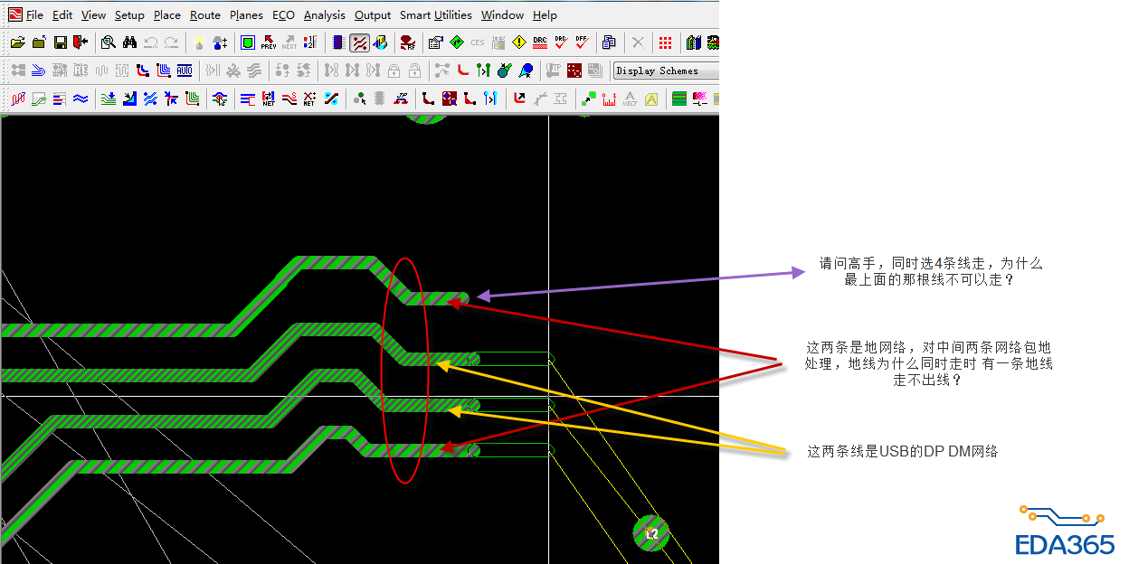 请问资深工程师,同时选4条线走,为什么最上面的那根线不可以走?