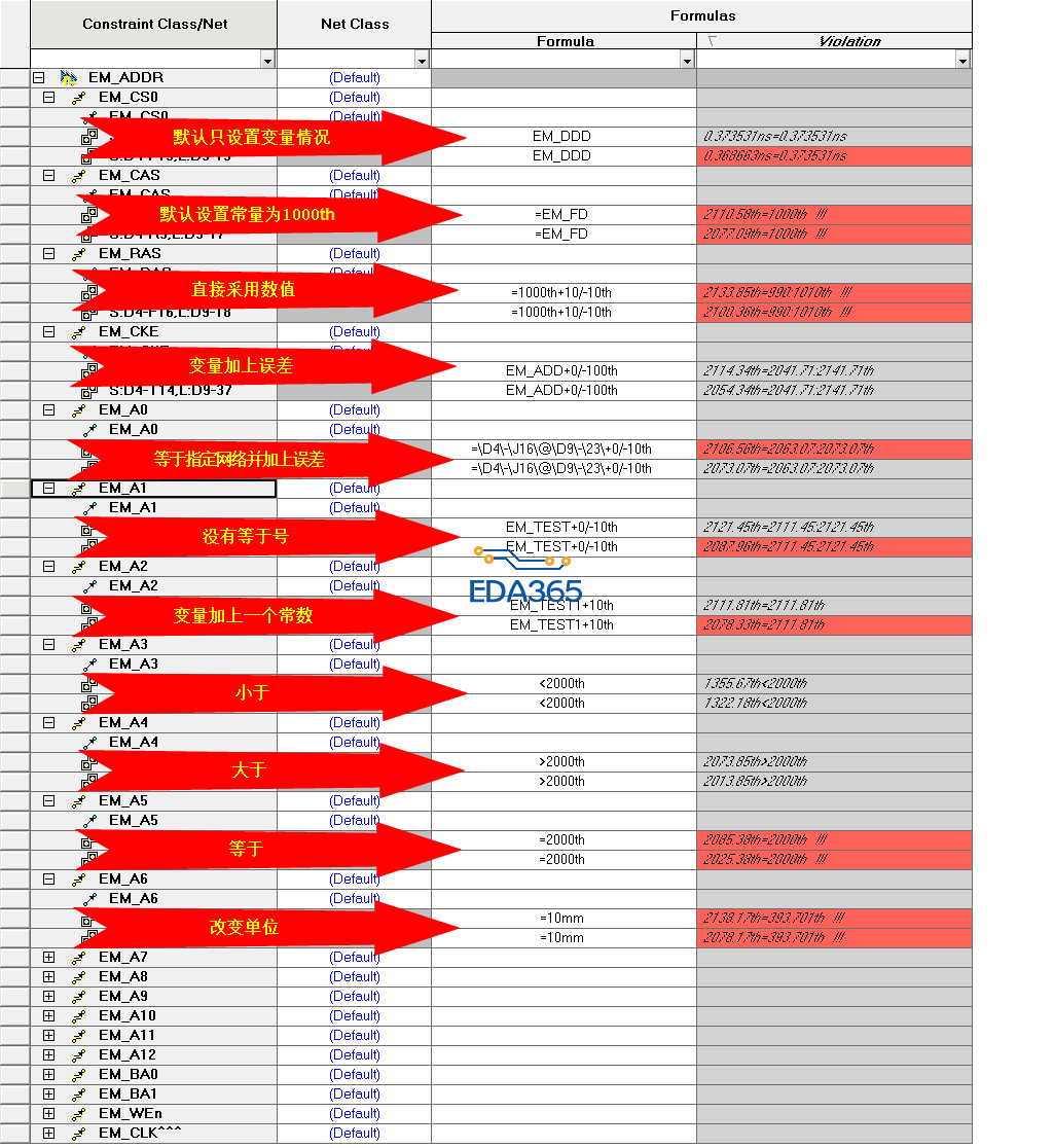 3、正常情况下是不需要去特意设置变量的,你只需要在Formula中输入一个替代变量即可,如你希望一组地址线的长度控制在正负50mil。你可以直接在formula中输入 ADD+0/-100th,那默认会生成一个变量ADD