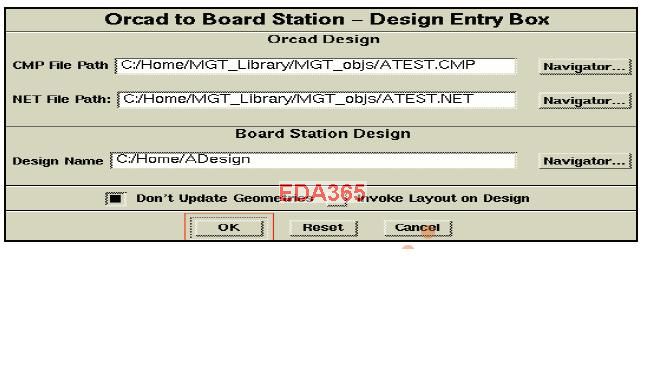 For Orcad USER:载入其它线路图工具输出的 .CMP & .NET档案: 1)从下拉选单,选择MGC> Orcad to BS... 项目,再选择Create/Update Design。 2)并依指示选择欲输入的CMP与NET档案