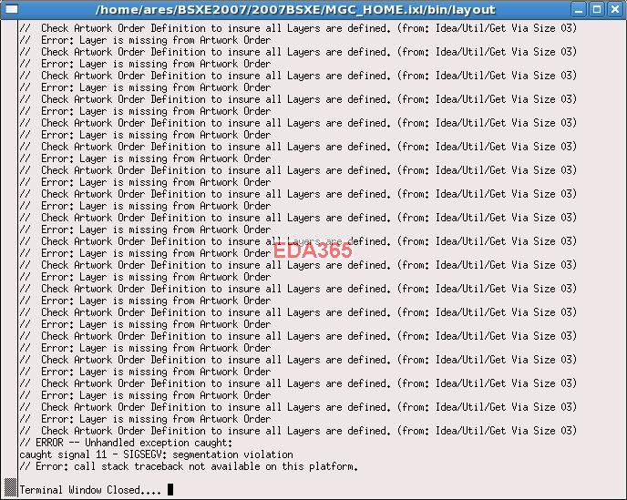 我是拿一个旧有的完整的设计,进librarian,直接删掉board,重新create geometry,自己画的board(结构比较简单),然后在set design rules/physical layer减掉最后的两层,artwork order也做了相应的调整,save,退出就出问题了。