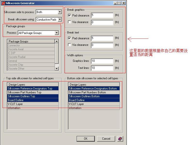 还有,正如那位兄弟所说的,你的silkscreen generator对话框设置的好像也有问题。我有时的设置见下图