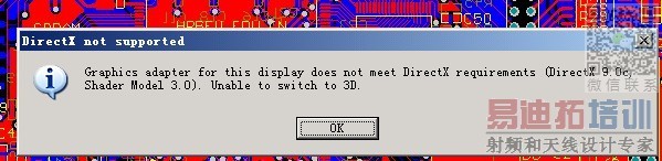 我也正纳闷中,为什么我的AD9.4在测试3D显示PCB板时,总提示当前的显示器不支持,然而我机器上是完全装有DirectX 9.0c的,而且,我也试过AD6.9版本就没有3D显示的问题。Altium公司提供的关于“解决访问或调用3D模型的问题?”的解决方法,虽然AD9安装目录\system目录中的确没有该文件,但结果还是没有解决。具体如下: