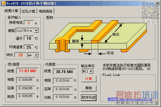 根据国际PCB制造标准IPC-2221规范设计的PCB设计助手工具,可根据用户的持续电流、铜厚、PCB线的温升系数、环境温度、走线长度。便可以准确地计算出所需要的PCB外层和内层走线的宽度、及走线内阻、及电流条件流过时所生产的走线压降、及走线功耗。