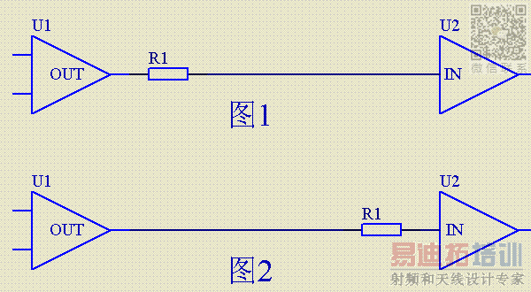1. 如果U1输出的是强信号,则按图1布局,因为强信号对周边电路的干扰较大,所以,将电阻加在U1输出端以降低后一段导线上的电压,以防止强信号对外界的干扰。