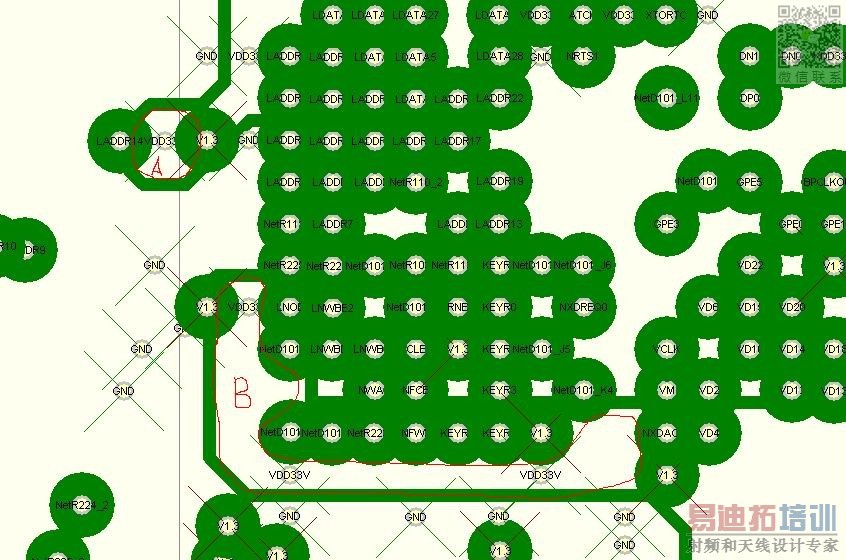 内电层大家都晓得是照片按负片反拍的.那么图中绿色的部分就是无铜区域.图中A,B