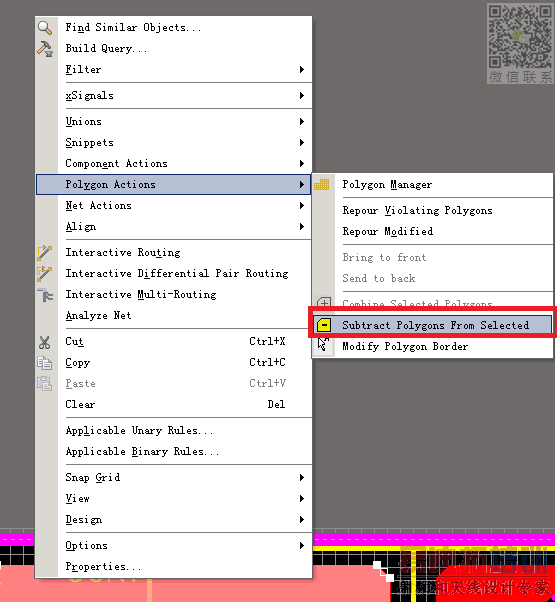 要在多边形(Polygon Pour)中间挖圆则执行Tool/Convert/Create Cutout from selected primitives