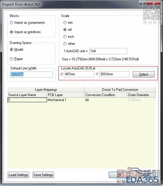 仔细看红色框内。把AutoCAD的原点放到......,你自己决定放哪里,可输入坐标,也可以点击select到PCB里去选点。
