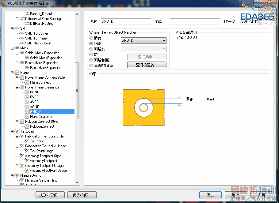 若想实现负片的铜距离其他所有孔间距的设置,建议设置10mil,手动挖大40mil的,若孔太多,可设置room规则,或者干脆做成正片。