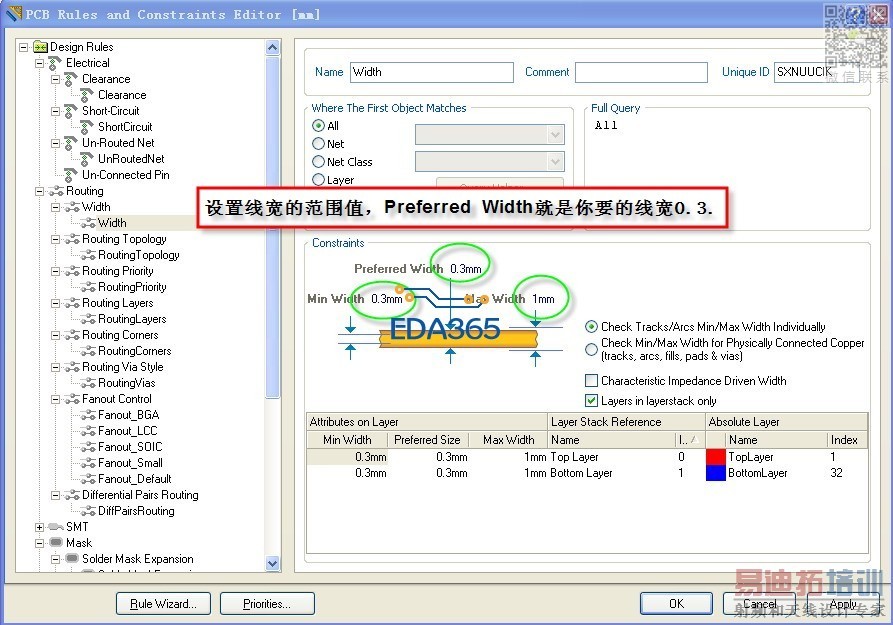 在rules里面的线宽设置/width constraint,设置线宽范围,把默认值/preferred width设置成0.3即可