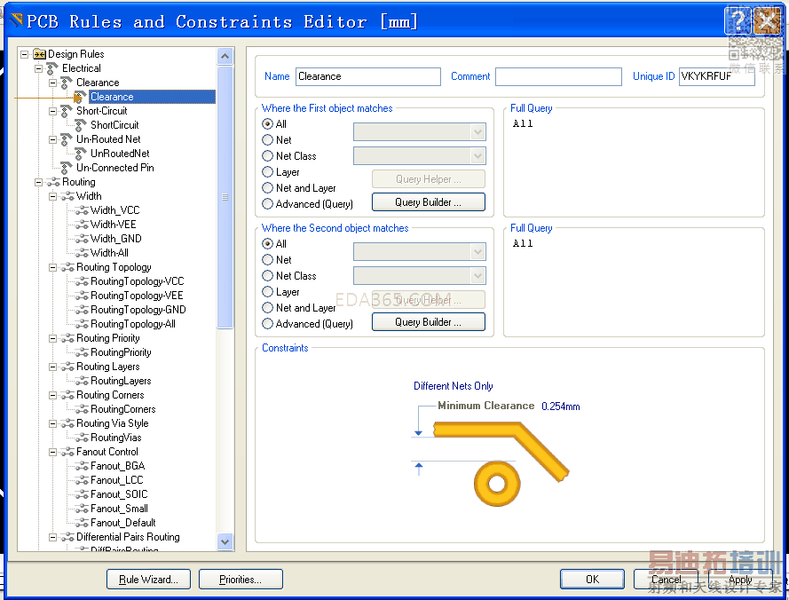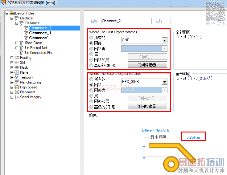 比如:VCC和NET1可以建一个clearance,