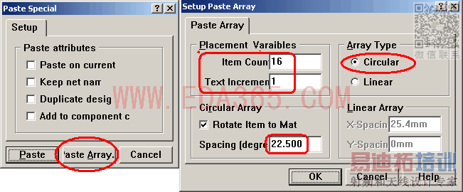 再在“编辑”菜单里选“选择性粘贴”。然后你想元件围绕啊个中心点阵列,就点一下哪里,再点一下元件中心。就阵列好了。