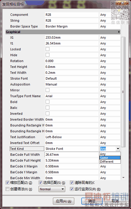 如果你只是想修改元件位号,那么需要将String Type的Designator改为same。Text Kind的Stroke Font就不用same了,否则万一存在TrueType Font的位号就不能被选中了。先将字体统一为Stroke Font再去改高度和宽度把。