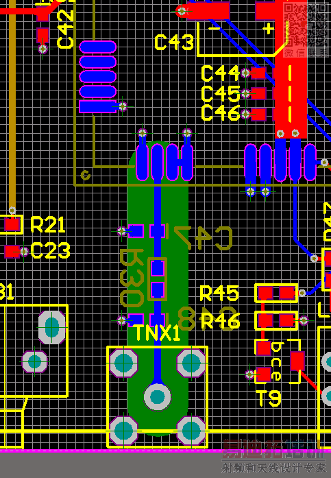 今天遇到一个4层板,其中用的M35 GPRS模块,天线出口的位置如图TNX1所示,模块到天线座的走线在底层,但是在地平面层画了一条很粗的线,不知道他这么画的作用是什么?请大神指点迷津。
