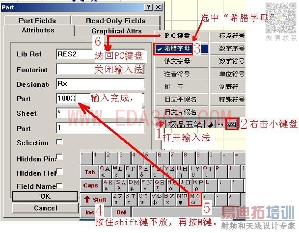 画原理图时,电阻的组织单位Ω(欧姆的符号)怎样加在电阻的下面的,Ω这个标号怎么输出来的?