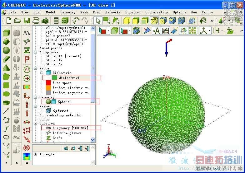 平面波入射介质球,半径0.5米,介电常数为3,入射波频率为900MHz的仿真及表面电流结果: