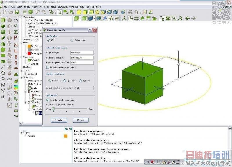 然后我们建立一条线段,如例题,长为lambda/2,位于立方体的3/4个波长的地方(我晕这里,也不说个具体方向,害我试了好几个才试出和例题一样,直接说个在-X轴上不就好了)我理解的是距离立方体表面3/4波长的距离,所以加了个1。不知道对不对