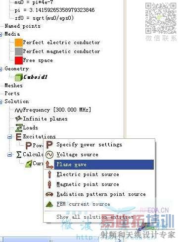 设置完上面后,我们选择如图的Excitations,然后右键选择,如图我们选择Plane wave电磁波。(当然你也可以在左边的条形选项中选择它)
