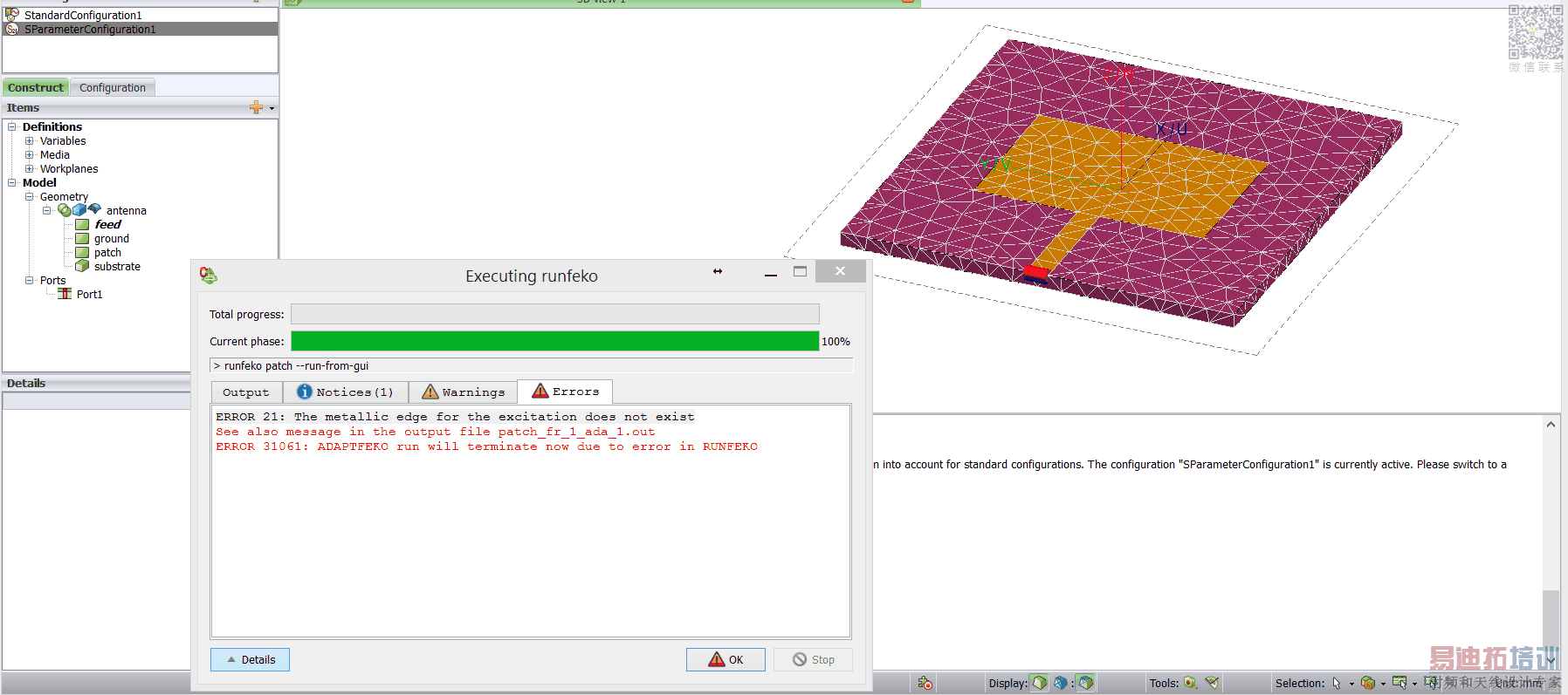 I want to simulate a microstrip patch antenna using FEKO but I get an error saying that