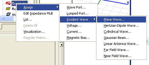 在excitation右键,assign>>incident wave>>plane wave