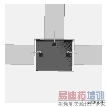 由公式选定屏蔽盒初始尺寸:长为16mm,宽为8mm,高为3mm,然后在HFSS 中建立模型。建模时,在基板上挖空一块来模拟芯片放置时的情景,如图5 所示。本文忽略了键合线和芯片材料、焊盘的影响。由于混频器中频输出端频率较低,辐射较小,不会导致屏蔽盒中的谐振,故该端口无需采用拱桥结构。基片采用Rogers RT/duroid 5880,介电常数为2.2,厚度采用0.254mm,微带传输线厚度采用0.035mm。