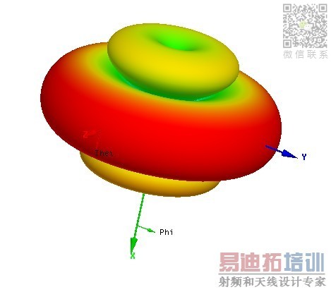 天线的方向图和天线的模型图分别如下所示,模型图中蓝色是Y轴,红色Z轴,绿色X轴。设计好的天线在实际使用中是X轴朝下,YOZ面和地面平行