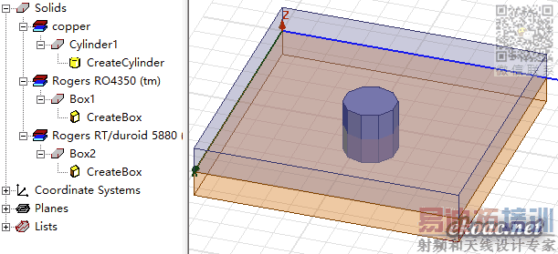 如下图,两个Box分别是5880和4350。圆柱是金属。此时运行仿真则会提示“Objects “Box1” and “Cylinder1” intersect. Objects “Box2” and “Cylinder1” intersect.”