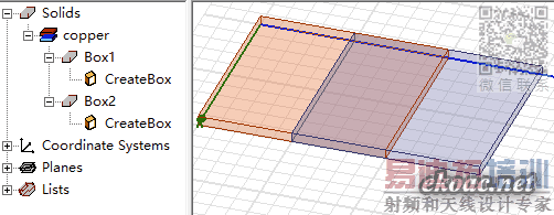 如下图,Box1和Box2是两个金属平板,它们之间相互交叉了一部分。此时运行仿真则会出现提示“Objects “Box1” and “Box2” intersect.”