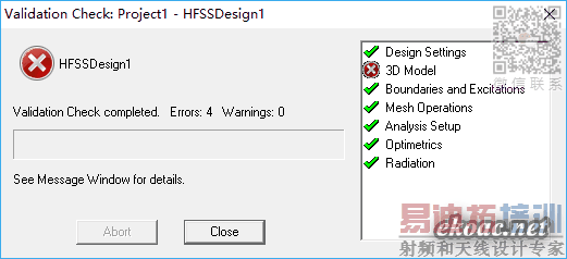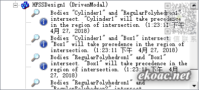 模型的重叠交叉(intersect)问题是HFSS建模中常见的问题,出现此问题时HFSS会给出如下提示: