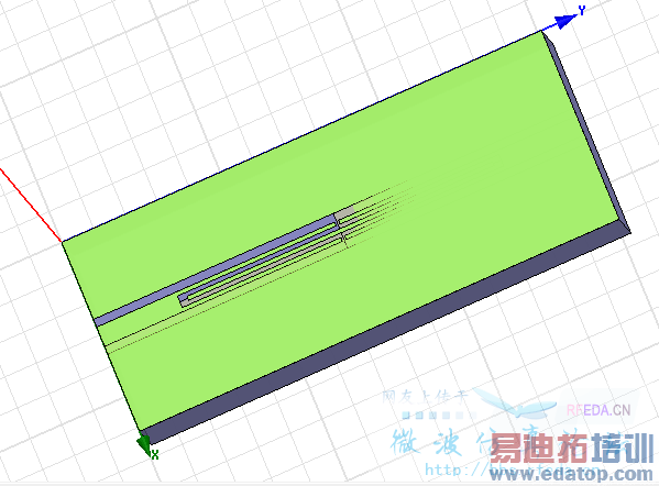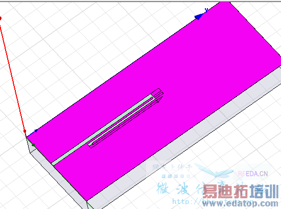 在我的电脑上 不管是在win7或是虚拟机下的xp环境下,hffs11或12都会经常出现某片区域变色,有时会扰乱编辑。见下图,金属板减去中间对称的块,就成了cpw和槽线共振结构。但是剪切操作之后被色彩挡住的部分丢失了! 这个诡异了!