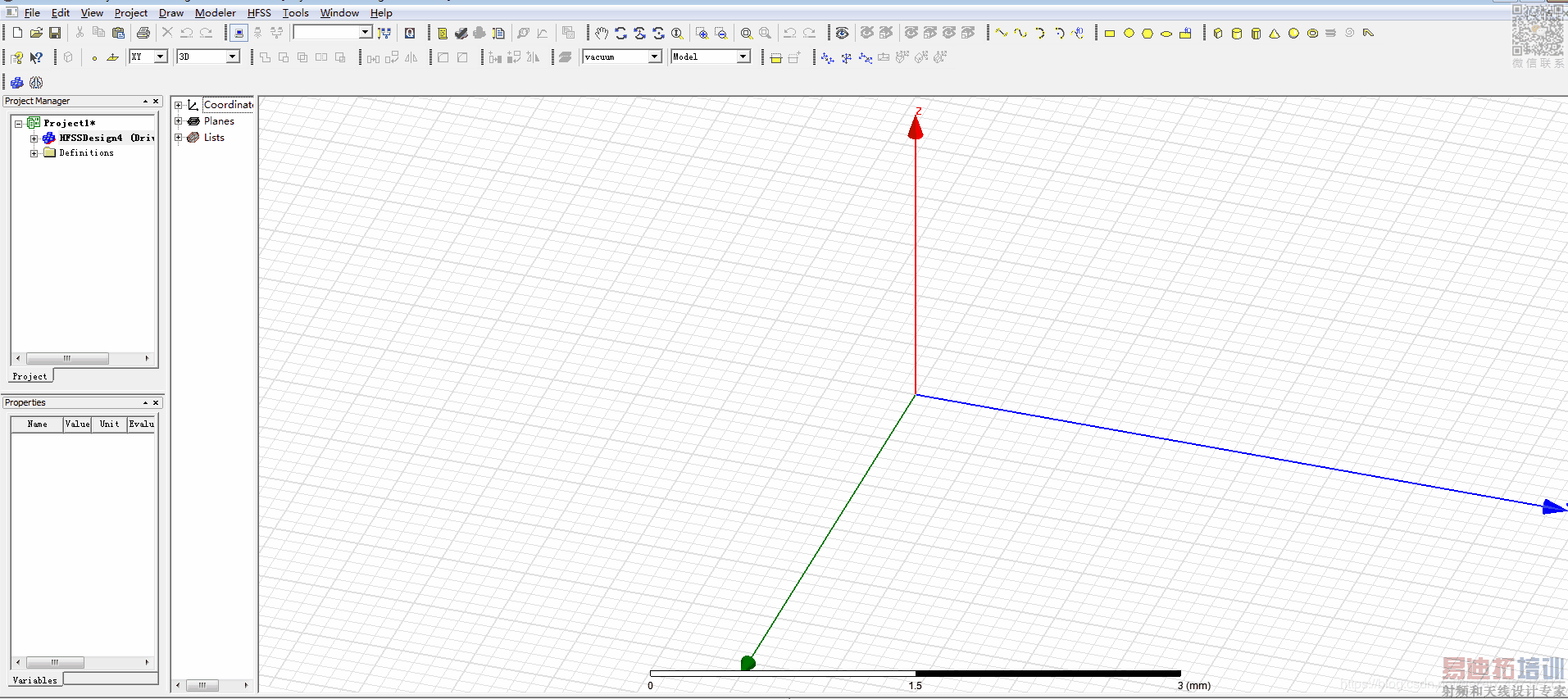 首先从简单的创建一个长方体模型开始,在HFSS中,创建一个三维物体的基本模型步骤如下: