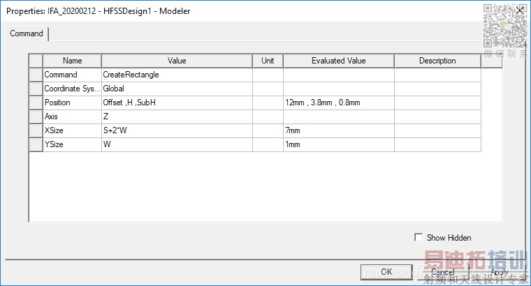 从主菜单栏中选择HFSS-->Design Properties 命令,打开设计属性对话框。在该对话框中单击Add按钮,打开add Property对话框,依次添加变量: