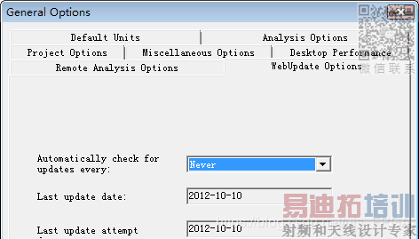 - 初次使用设置: 1、 破解完毕后即可打开软件,出现错误信息Internal error: WebUpdate或警告信息,不要理它,进入HFSS选中Tools->Options->General Options->WebUpdate Options (tab)->Never就可以避免再出现该信息了(将自动检查更新选项改成never,就是不要通过网络升级)。