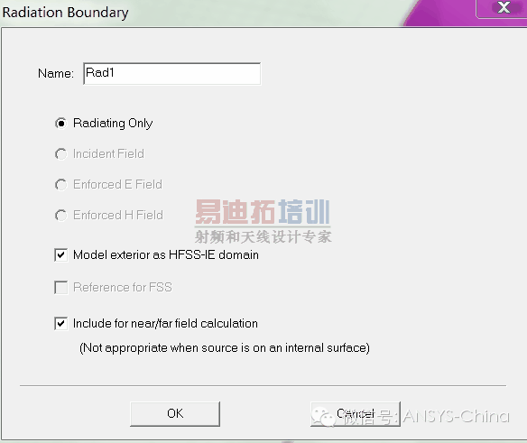 FEBI边界属于辐射边界的高级功能,如图1所示,在传统辐射边界的设置基础上勾选Model exterior as HFSS-IE domain即可生成FEBI边界。