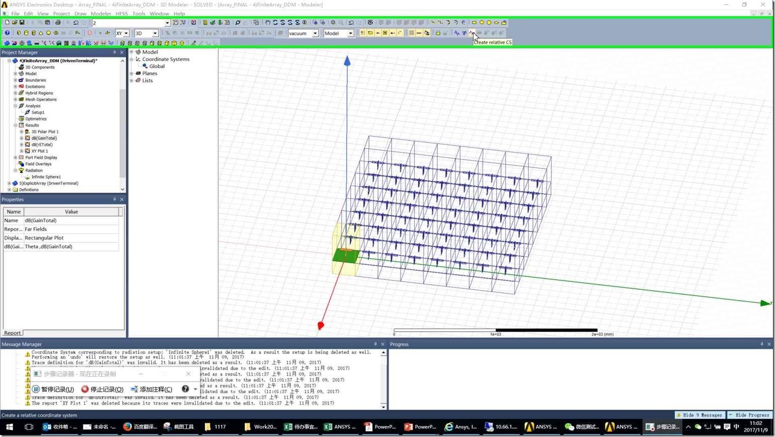 步骤 19: 用户在"Progress (窗格)"上左键单击(在"ANSYS Electronics Desktop - Array_FINAL - 4)FiniteArray_DDM - 3D Modeler - SOLVED - [Array_FINAL - 4)FiniteArray_DDM - Modeler]"中)