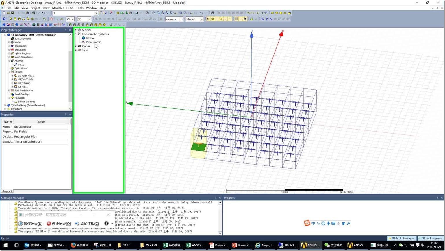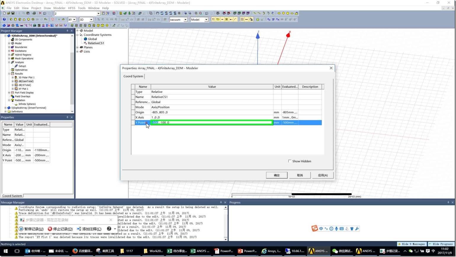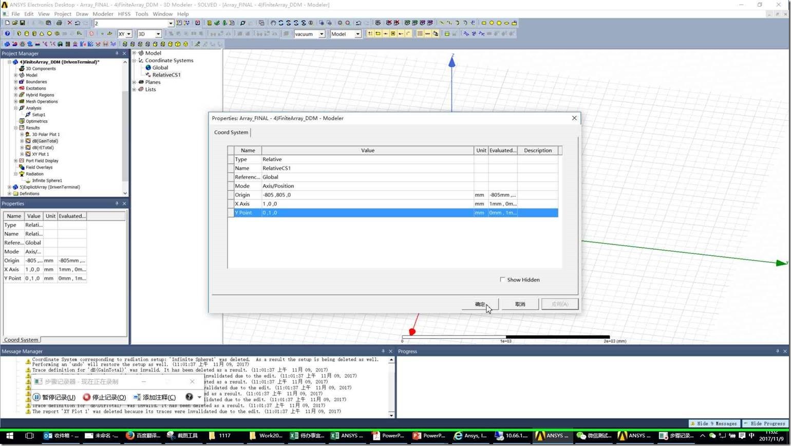 步骤 21: 用户在"Properties (对话框)"上左键双击(在"ANSYS Electronics Desktop - Array_FINAL - 4)FiniteArray_DDM - 3D Modeler - SOLVED - [Array_FINAL - 4)FiniteArray_DDM - Modeler]"中)