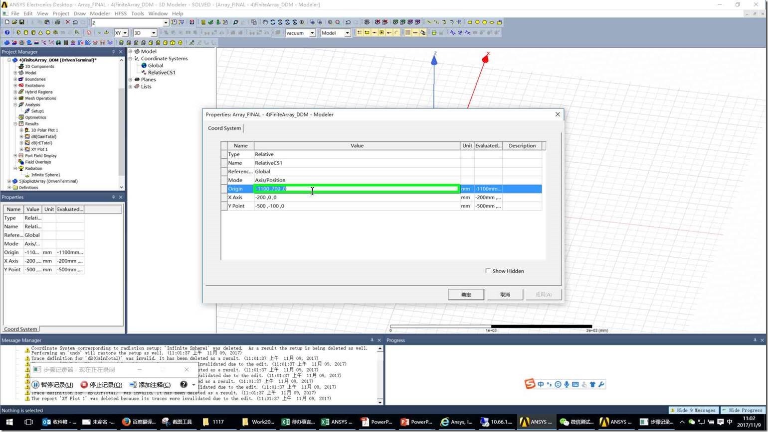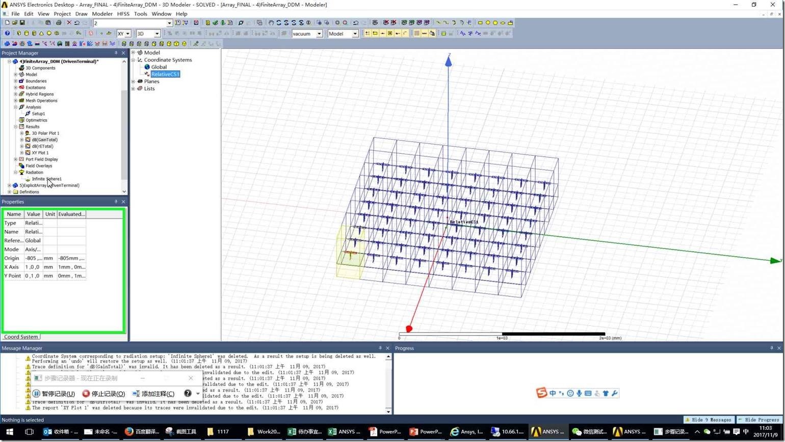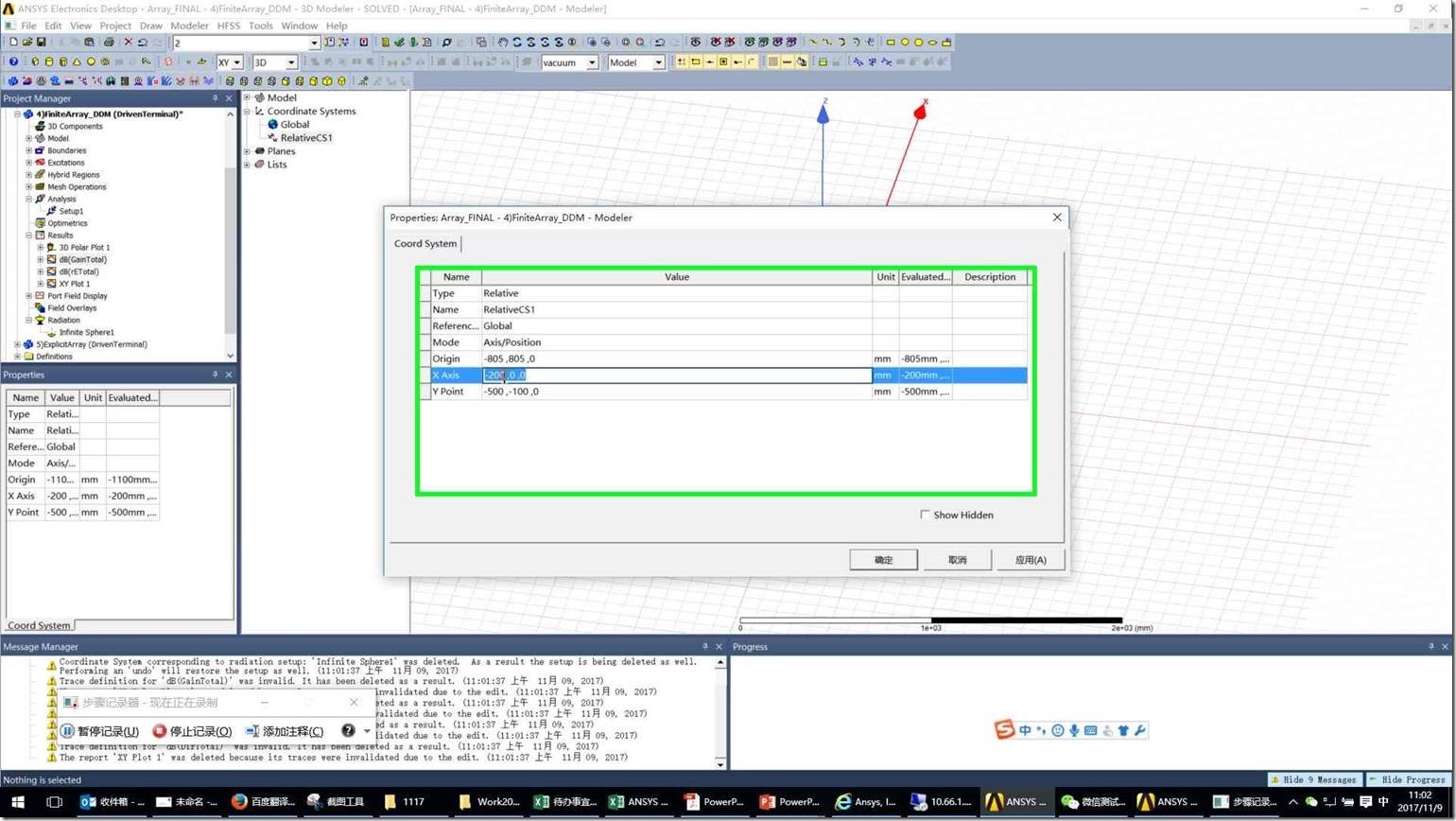 步骤 11: 用户在"Properties (对话框)"上键盘输入(在"Properties: Array_FINAL - 4)FiniteArray_DDM - Modeler"中) [Delete Delete ...]