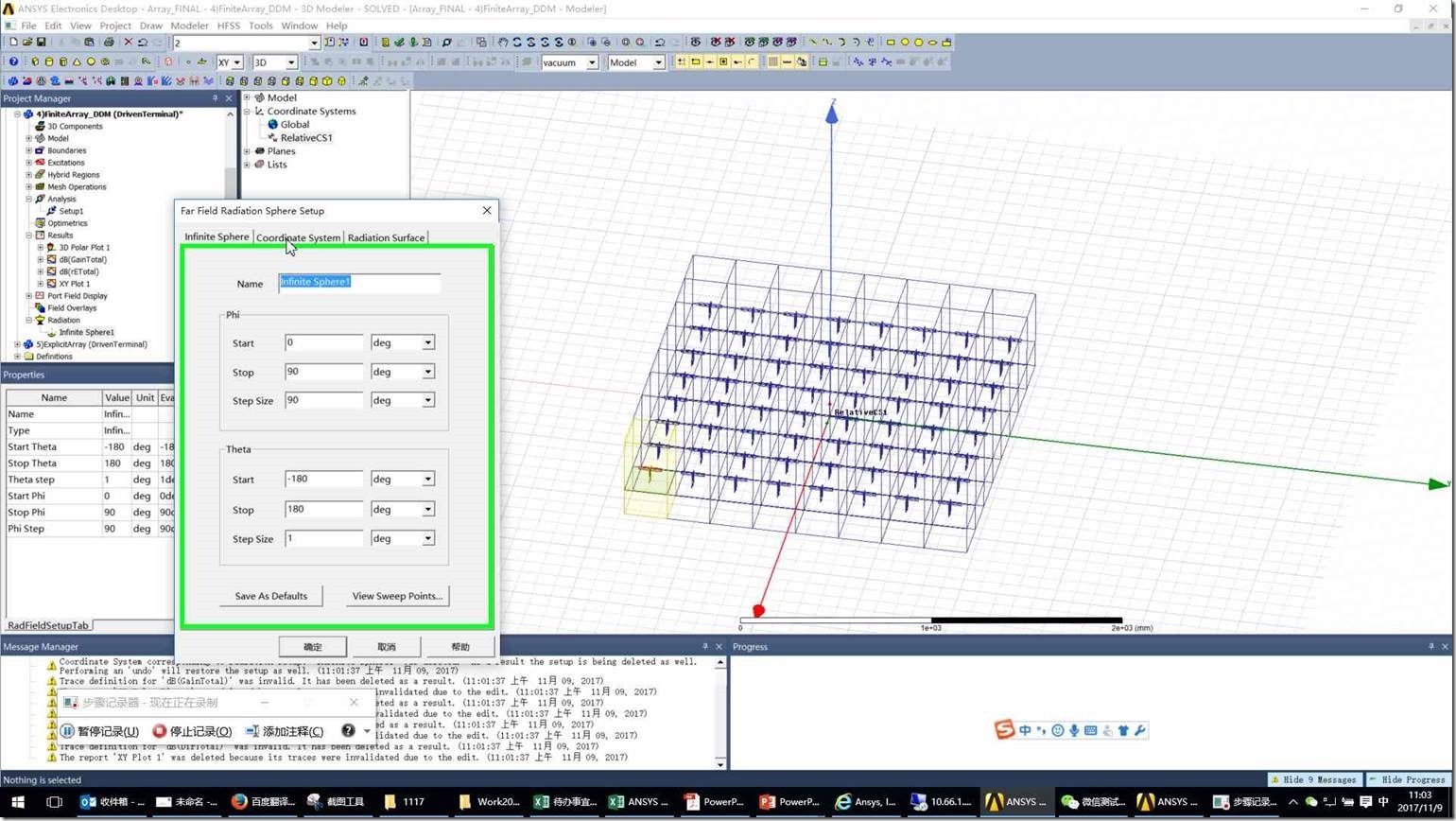步骤 13: 用户在"Properties (对话框)"上鼠标拖动开始(在"Properties: Array_FINAL - 4)FiniteArray_DDM - Modeler"中)