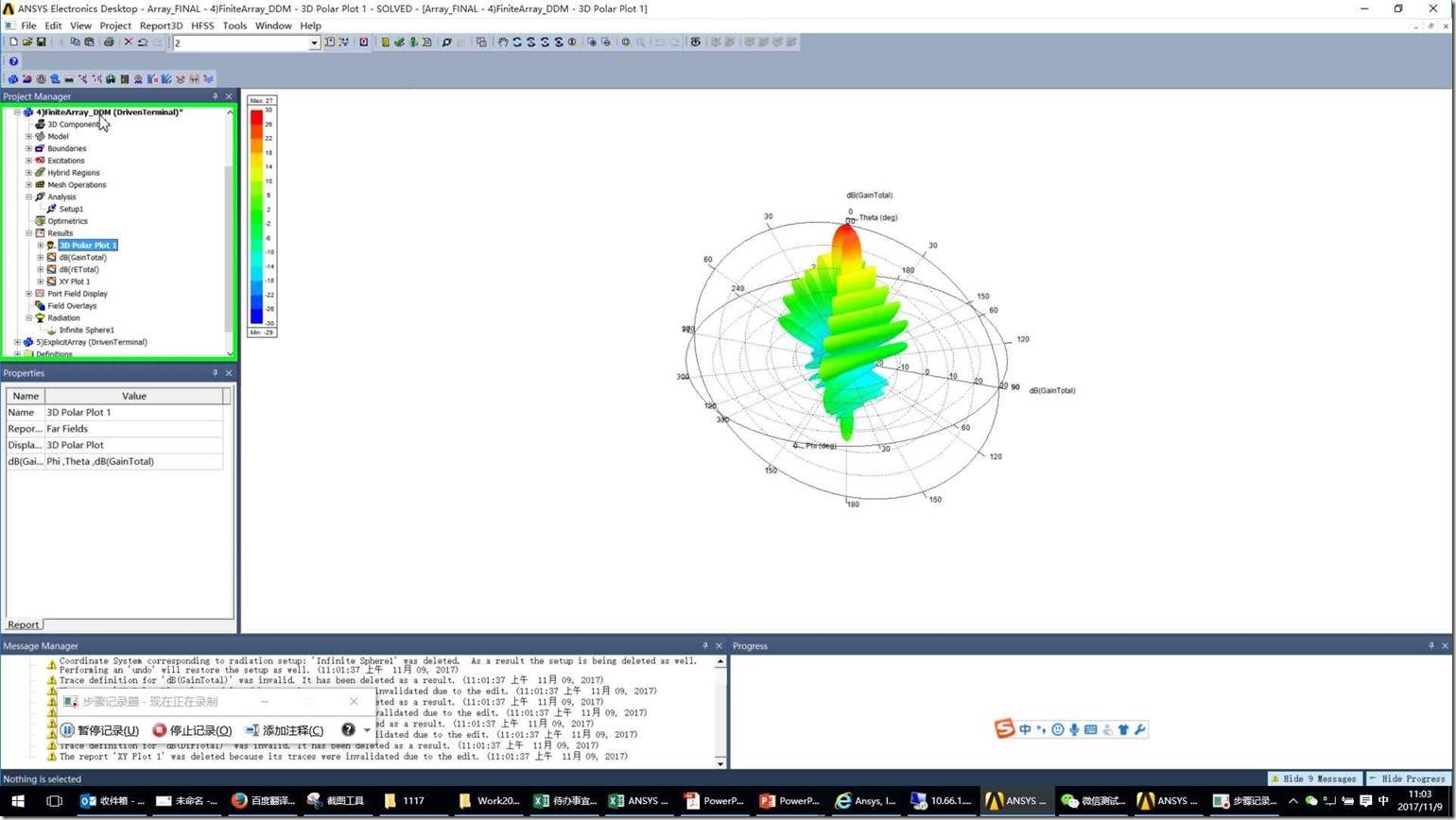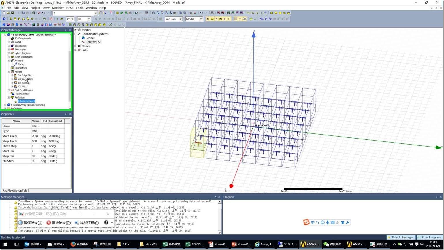 步骤 20: 用户在"Progress (窗格)"上左键单击(在"ANSYS Electronics Desktop - Array_FINAL - 4)FiniteArray_DDM - 3D Modeler - SOLVED - [Array_FINAL - 4)FiniteArray_DDM - Modeler]"中)