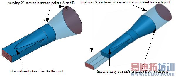 HFSS treats each port that you define to be connected to a semi-infinitely long waveguide or transmission line that has the same cross-section and properties as the wave port. The placement of the wave port is critical because it can affect the accuracy of the solutions. If the wave port is close to a discontinuity due to change in shape, dimension, or material of a structure the resulting 3D field can be a superposition of propagating and non-propagating modes.