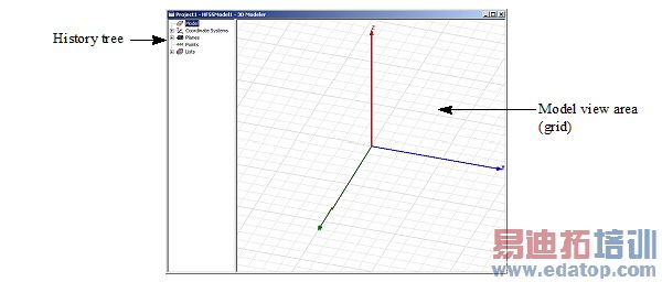 The 3D Modeler window consists of the model view area, or grid, and the history tree, as shown below: