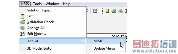 You will need to click HFSS>Toolkit>Update Menu to cause the Toolkit menu to display the MIMO selection.