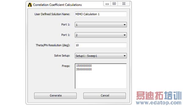 From here you can select Ports, specify the Theta/Phi resolution in degrees, and select the Solve Setup. Click Generate to apply the settings.