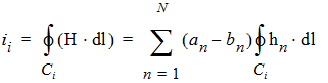 where a and b are the unitless complex modal coefficient vectors. In order to obtain a terminal representation of the black-box, N integration paths Ci and N integration loops Li are used to define N voltages and N currents, respectively,