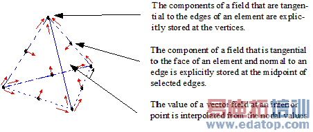 The value of a vector field quantity (such as the H-field or E-field) at points inside each tetrahedron is interpolated from the vertices of the tetrahedron. At each vertex, HFSS stores the components of the field that are tangential to the three edges of the tetrahedron. In addition, HFSS can store the component of the vector field at the midpoint of selected edges that is tangential to a face and normal to the edge (as shown below). The field inside each tetrahedron is interpolated from these nodal values.