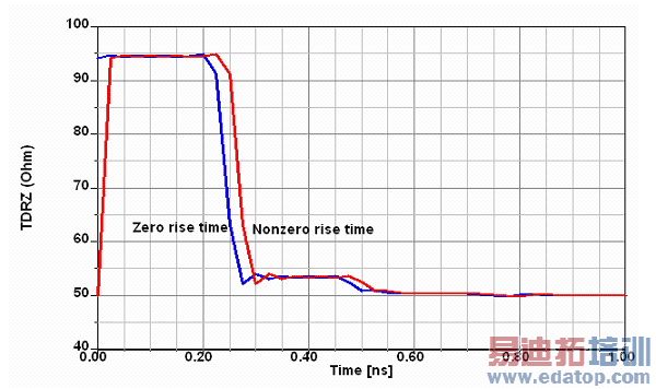 The plot below shows the difference between a short nonzero rise time and zero rise time for a transmission line segment of 94 Ohm. Note that the trace with zero rise time starts at the correct line impedance while the other starts at the renormalizing impedance. Other than that, one trace is a shifted version of the other. The reason the plot with finite rise time starts at 50 ohms is that the time-domain voltage and current are still at their steady state values, so v = Zref * i. As the pulse arrives, the TDRZ response changes from the steady-state behavior because there's a reflection from the transmission line back to the exciting source, which has a different renormalizing impedance from the characteristic impedance of the transmission line.