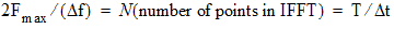 Let N be the number of points in the IFFT. N equals the number of time samples, and it also equals twice the number of frequency samples. The density of frequency samples in the frequency sweep influences the total time T as follows: