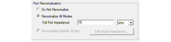 This option lets you vary the value of Z0ref. When you do not renormalize Z0ref is Z0 . When you renormalize as shown in the figure below, Z0ref will no longer be Z0 but it will be assigned the value that you enter in the Full Port Impedance field. The settings in the figure below makes Z0ref = 75 ohm.